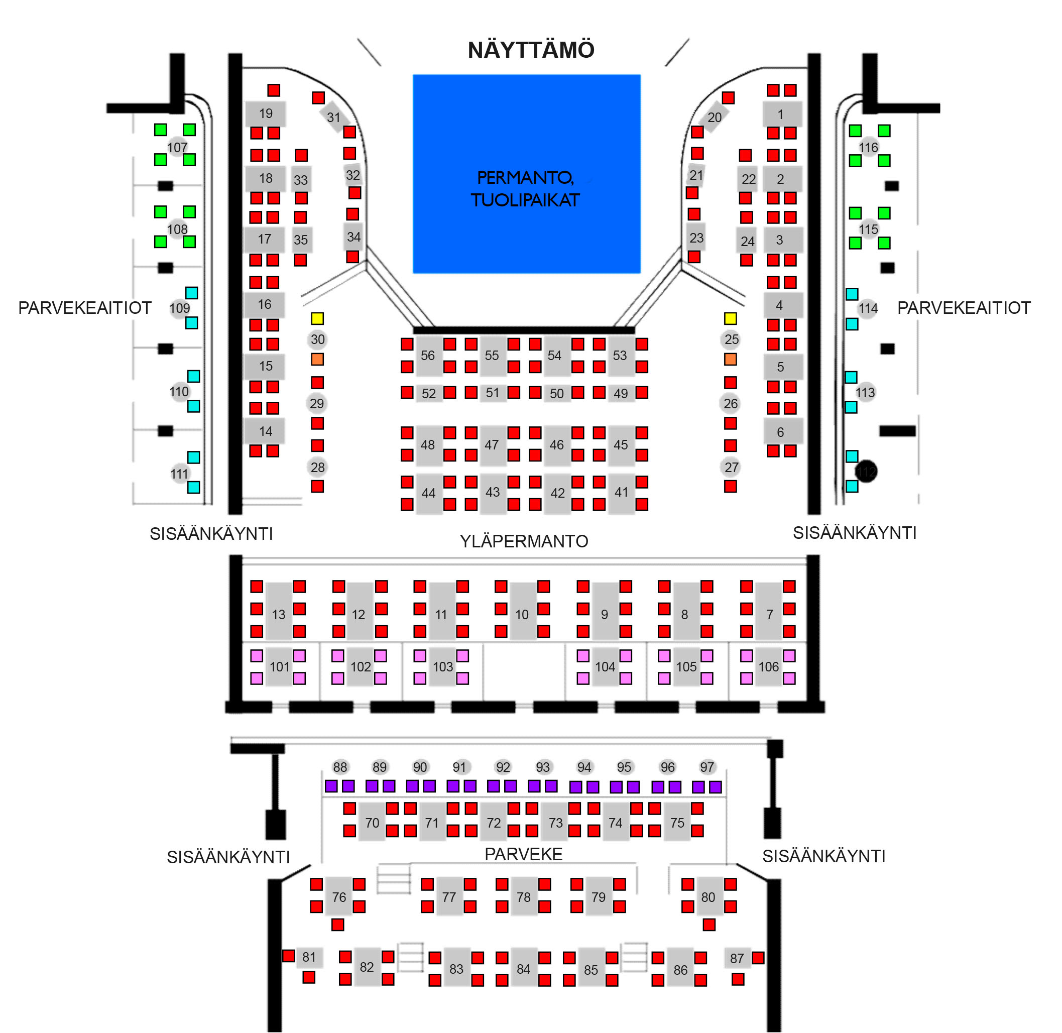 - Paikkoja on 748, joista pyörätuolipaikkoja on 6